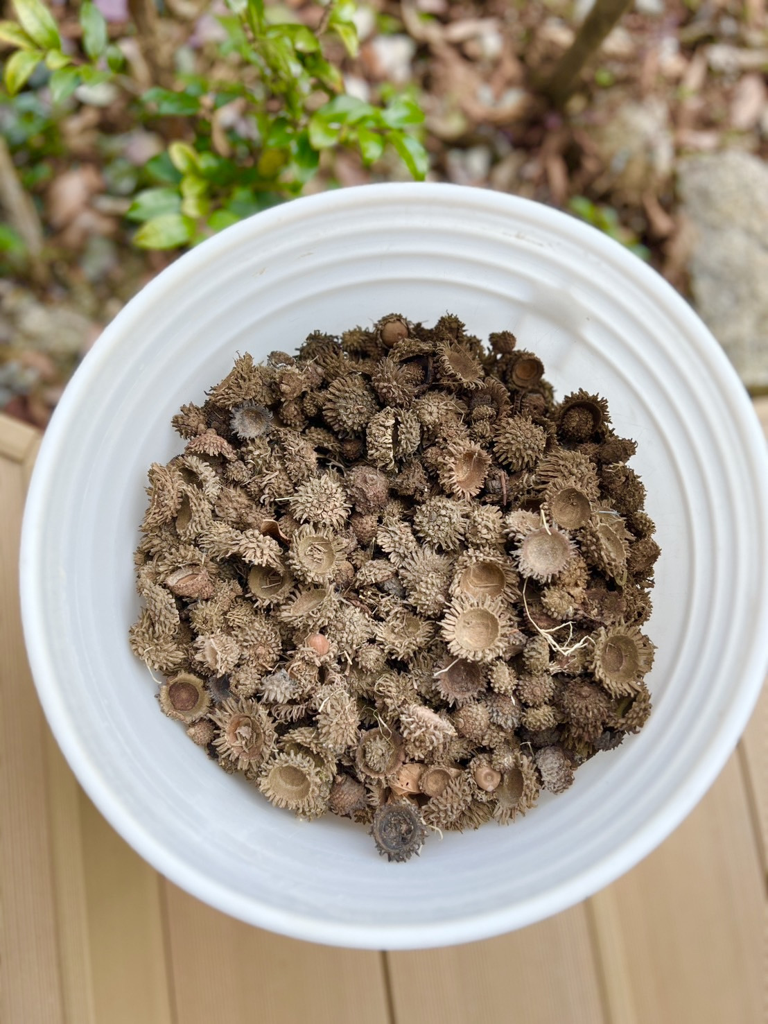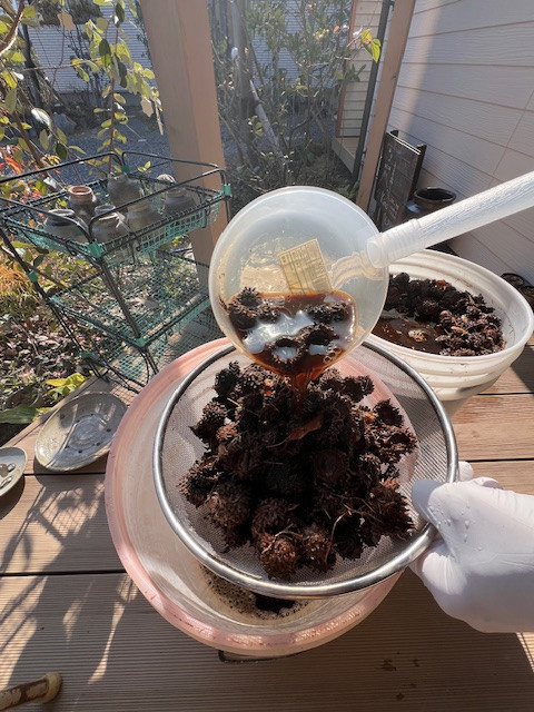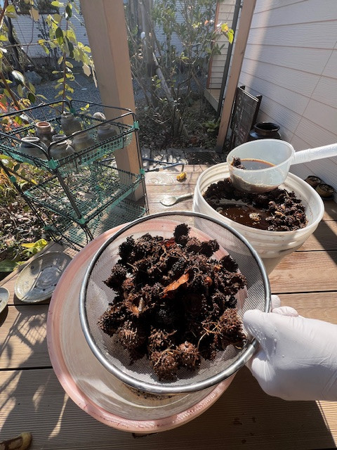 「とちしぶ液」は、どんぐりの笠のヘタ部分を水に1週間程漬け置きしておくと出来上がる黒っぽい褐色の天然染料です。